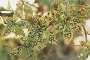 | 症状 | 葉表に小黒点(菌体)の集団がスポット状に数カ所生じるが,黒点が葉のほぼ全面を覆うこともある。個々の小黒点は光沢があり,やや隆起して生じる。黒点が形成された部分は,葉色がうすれて黄色みを帯びる。 |