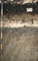 | それらの糞や落ち葉が分解されてどろどろの腐植成分になり,土の中に浸み込んでゆき,土の中でさらに微生物に分解されてゆきます。この過程で土は黒褐色にかわり,また軟らかくなるのです。 | ![]() ミミズによる孔隙が 多い土壌の断面 40㎝までは新しい火山灰,それ以下は 新第三紀層の風化物を材料にした土壌  |