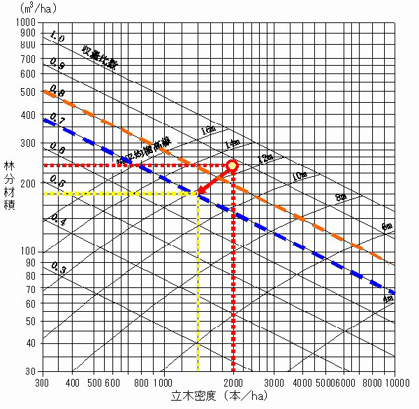 | ※図の例では,当初2000本/ha・240m3/haだった林分(オレンジ色の丸印)が,間伐後,矢印の方向へ移動して1400本/ha・180 m3/ha になる。 |