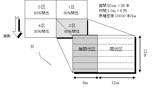 間伐することで,どのていど生枝の枯上がりが抑えられ,形状比(=樹高/幹  直径)が変化するのか調べました。調査は,門別町富川のクロマツ海岸林(1987年造成)で行ないました(図-2)。この林分は1992年5月に間伐され  ,再調査は2001年(15年生時)に行ないました。2001年現在,内陸側の1区・3区は地位指数が7程度,海側の2区・4区は8程度の林分です。