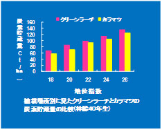 炭素固定量は次の通り算出しています。 炭素固定量( 炭素トン/ha )= 材積(m3/ha) × 比重 × 木材に占める炭素の重量割合(%)
