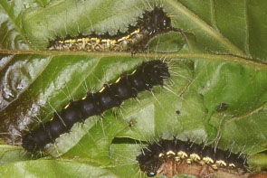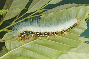 最大長約80mm.小さなうちは色は黒く,毛は少ない.集団でいることが多い.成長すると水色の長い毛がびっしりと生える.春から初夏にクリ,クルミ,トチノキ,ウダイカンバなどの葉を食べる.