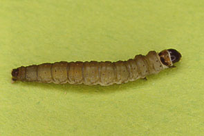 | イモムシ,その3 イボ状の脚はない.触角はヒゲ状.尾端に細長い突起が2本ある. |