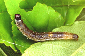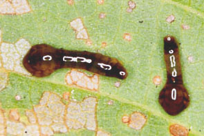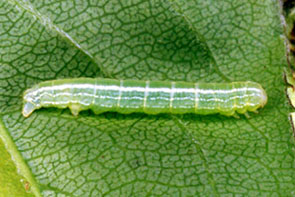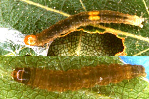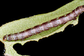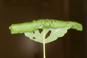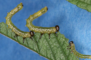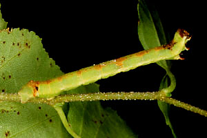 | シャクトリムシ イボ状の脚(腹脚,ふくきゃく)は2対.触角は不明瞭. |