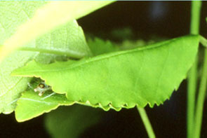 | ハキリバチ 葉が直径1cmほどで円く切り抜かれる.ハチの成虫.翅(はね)は膜状.触角は細長い. |