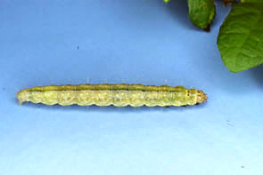 | シャクトリムシ,その2 イボ状の脚は2~3対.頭はみえる.触角は不明瞭. |