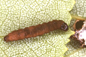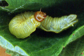 | イモムシ,その2 (ハマキムシ) イボ状の脚は5対.単独性,糸で葉を巻いたり綴る.触角は不明瞭. |