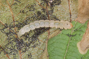 ハンノキスイコバネ 早春にヤマハンノキ類の葉に潜るウジムシ(幼虫).最大長約6mm.糞は糸状につながる.