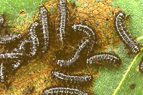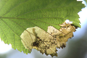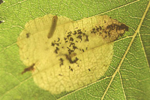 シラカバノクロホシハムグリハバチ 6~8月にシラカンバの葉に潜るウジムシ(幼虫).最大長約6mm.糞は粒状.