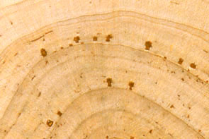 カバノモグリバエ カンバやハンノキの幹の地際近くの材内に茶色の変色がある.幹横断面では年輪に沿った細長い形(最大幅約5mm),縦断面では縦筋となって現れる.