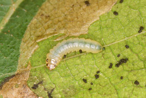 ナミスジフユナミシャク 最大長約20mm.春に広葉樹各種の若葉を食べる.普通,葉を巻いて,その中にいる.