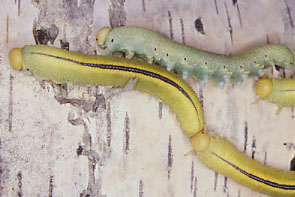 カラフトモモブトハバチ 6~9月にカンバ類の葉を食べる大形の黄色や緑色のイモムシ(幼虫).最大長50mm.体の模様には変異があり,ときに横に黒い斑紋が現れる.