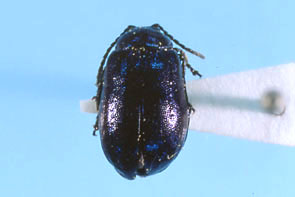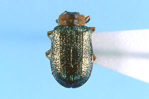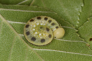 ミヤマヒラタハムシ 幼虫は6月に出現,体長最大10mm前後.体は後方に向かい徐々に細くなる.成虫は緑~青色に輝く扁平な甲虫.体長7mm前後.春~秋までみられる.ともにハンノキ属とカバノキ属の葉を穴を開けるように食べる.