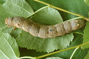 ムクゲコノハ 最大長約90mm.6月と8月に発生する.体の中央背面に青く丸い斑紋がある.