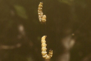 葉に穴や食べ痕.イモムシ,毛虫,シャクトリムシがいる.ときに糸で巣を作る.