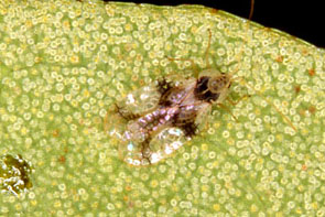 多数の小さな虫,抜け殻,異物がみられる.食べ痕はない.しばしば,葉が黒ずんだり,スプレー上に白から黄色に変色する.