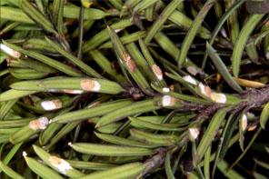 イチイカタカイガラムシ 最大長約3mm.若枝や葉裏につく.