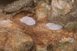 イヌガヤワタカイガラムシ 淡い茶色の楕円形,最大長約5mm.白い綿は卵のかたまり,最大長約1cm.葉裏につく.