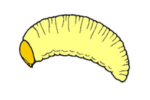 キンケクチブトゾウムシ 最大長約10mm.俵形.脚はない.頭部は黄色.体は淡い黄色.