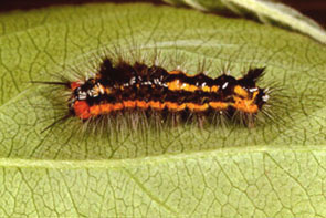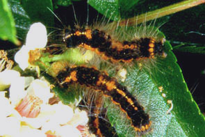 ドクガ 最大長約40mm.体は黒色とオレンジ色.黒色の部分が少ない幼虫もいる.毛束はない.春に集団で低木の葉を食べる.