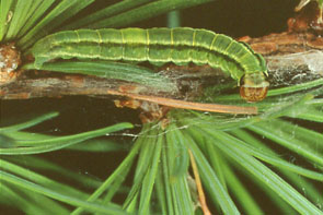 カラマツイトヒキハマキ 最大長約18mm.背中に2本の黄色または黒色の縦縞がある.6月に発生,葉を束ねたり,枝上に糸を張り巡らす.