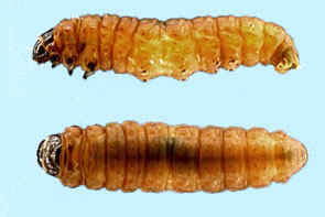 カラマツタネバエ ウジムシ,最大長約6mm.頭は不明瞭.脚はない.体は白っぽい.