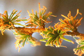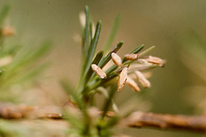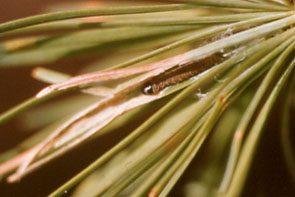カラマツツツミノガ 5~6月に葉が先から茶色に枯れる.最大長約5mmのうす茶色の蓑をまとった虫がいる.