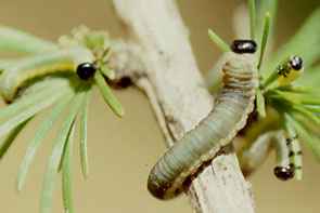 カラマツキハラハバチ 最大長約15mm.頭は茶色,成長するとてっぺんに暗い縞が現れる.体は緑色.6~8月に発生.枝先の葉だけを食べる.