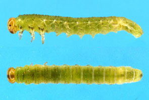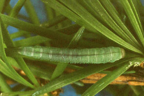 カラマツヒメハマキ 最大長約12mm.頭部は黒い.体はやや太く,茶色,頭部近くの背面は黒い.春と夏に発生.葉を糸で束ねる.