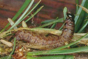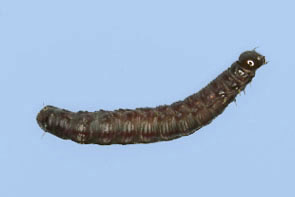 ギンムジハマキ 最大長約18mm.頭部は茶色から黒色.体は茶色から焦げ茶色,黒い斑点がある.6月頃に発生.