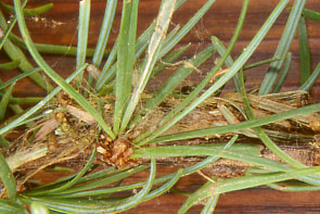 葉が黄ばんだり,枯れる.樹上に虫や異物はみられない.細根が減少したり,根の樹皮にかじり痕.たいてい土中に多数の虫. |