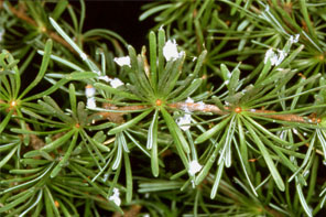 カラマツカサアブラムシ 春から初夏に葉裏に小さな白い綿のかたまりや微小な黒い粒が付着する.