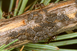 カラマツオオアブラムシなど 春から秋に枝や細い幹につく茶色~黒色のアブラムシ.4種が含まれる.