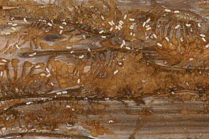 中に虫や虫糞がみられる.ときに表面に穴が開き,虫糞がでる. |