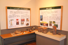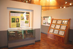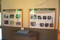 野ネズミの巣の模型、主な森林害虫などの標本、広葉樹林のミニジオラマ、パネル(エゾシカなどの獣害、森林と菌類、木材腐朽、害虫を食べる野鳥など)