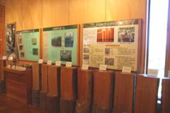 北海道の主要樹種の材見本、高性能林業機械のミニ模型、森林の土壌断面(褐色森林土)、パネル(間伐、天然更新、優れたカラマツ、衛星リモートセンシングなど)