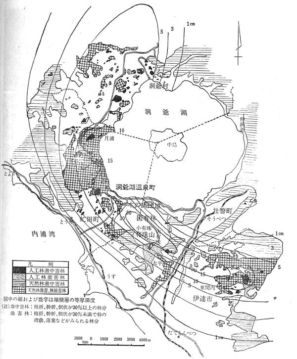 以上のほかに噴出物の地表面堆積による樹幹の埋没は降灰地全域に発生したが,森林地域では堆積の最も厚い個所が有珠山麓で約50cmであり,噴源から遠ざかるに従い薄くなっており,樹体の小さいトドマツ造林地の幼齢木が埋没のため枯死した例があるが,全般的には灰の堆積による被害は少なかった。
