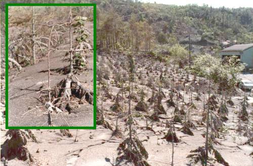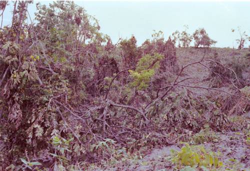 すなわち①前者では葉の脱落や葉脈のみ残存する被害と,枝,幹の表皮剥離,裂傷が多く,枝や幹の折損は少ない。②後者では微粒質の火山灰が枝葉に付着堆積し降雨により重量を増し,幹や枝に倒伏折損の被害を与え,また乾燥とともにモルタル状に固化し容易に脱落しない状態となり,倒伏・折損しないまでも葉の光合成と呼吸作用を阻害し葉を脱落せしめた。