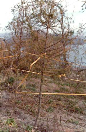 この被害形態はその後の回復の経過においても明らかな違いになって現われており,前者の1カ月後の9月初旬の木の実団地はヤナギ,ドロノキ等殆んどの広葉樹およびカラマツから新葉が開きはじめ,あたかも早春の観を呈した。一方,堆積約10cmの月浦では樹高3mのカラマツ林で,すべての立木が枝葉は下垂し,樹幹を倒伏させた当初のままの惨状を呈していた。これらの降灰直後の灰の付着量は降灰厚10cmで高さ6mのカラマツは枝葉の重さの8倍の約90kg,高さ3mのカラマツは枝葉の重さの6倍の約50kgであった。トドマツでは折損倒伏は少ないが,枝を下垂させた状態が続いた。広葉樹は折損の害が多かった。以上の如く森林,立木に与えた被害は主に後者の降灰付着によるもので,いくつかの事例を写真で紹介しておく。(写真1、2、3、4)