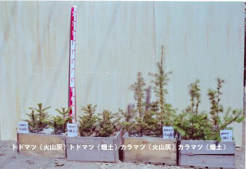 噴出物堆積地での針葉樹の植栽は,土壌のアルカリ性化による障害を懸念し,年内植栽は控えるよう指導したが,11月植えこみによる場内での堆積物による冬期問の温室内植栽実験と露地での植栽越冬実験を行なった。pH値は植込時8.3と8.2であったが,一冬越した53年6月には7.7と6.7に下がり,帯雪下にあった露地では中性状態となった。植栽した苗木は,針葉樹としてトドマツ,カラマツ,モンタナマツ,広葉樹では,ケヤマハンノキ,ミヤマハンノキ,センノキ,タニウツギの山行苗を使ったが,温室内では冬期間に開芽開葉,生長を終えた。(写真-6)