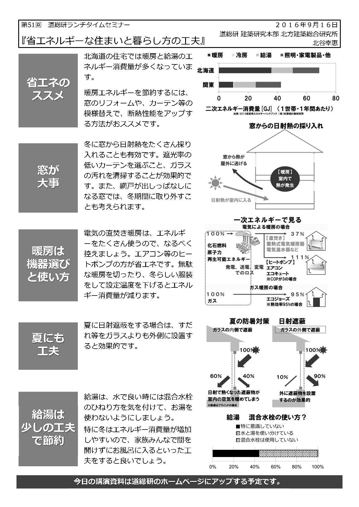 給湯エネルギーの節約術としては、まず、混合水栓(蛇口)の使い方の工夫があります。水で良い時にはお湯が全く出ないような蛇口のひねり方(レバーの位置)にします。また、特に冬は給湯エネルギーが増加しがちです。冬期はお風呂のお湯が冷めやすく、特にヒートポンプの場合は機器の性能上、外気温が下がると効率も低下します。家族みんなが、なるべく短時間に続けてお風呂に入るなどの工夫をすると良いでしょう。