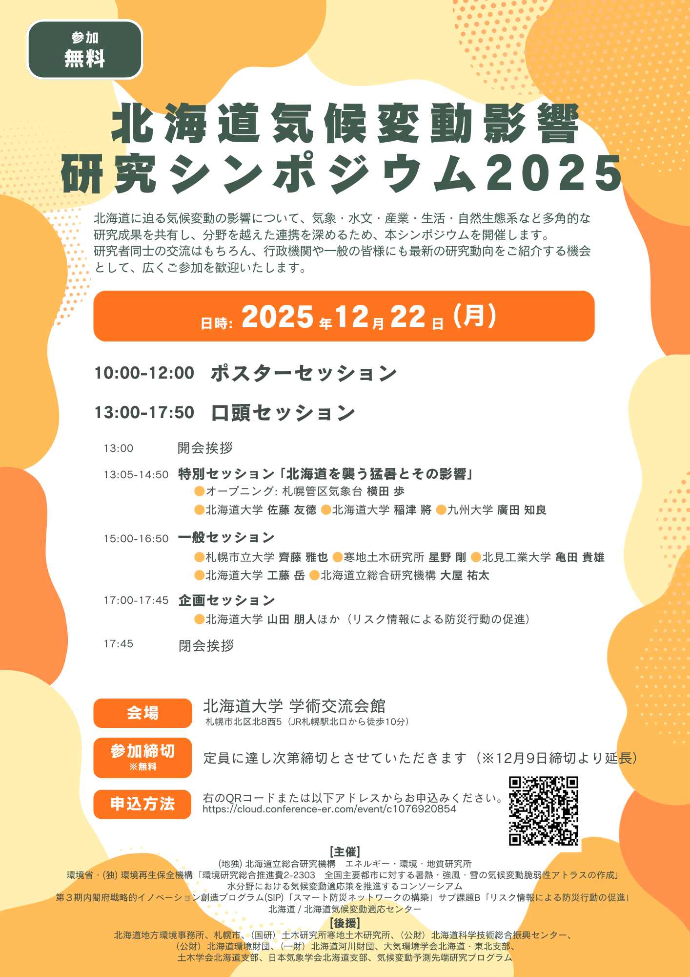 https://cloud.conference-er.com/event/c1076920854 - 主催: (地独)北海道立総合研究機構 エネルギー・環境・地質研究所、環境省・(独)環境再生保全機構「環境研究総合推進費2-2303 全国主要都市に対する暑熱・強風・雪の気候変動脆弱性アトラスの作成」、水分野における気候変動適応策を推進するコンソーシアム、SIP第3期課題「「スマート防災ネットワークの構築」サブ課題B「リスク情報による防災行動の促進」」、北海道 / 北海道気候変動適応センター