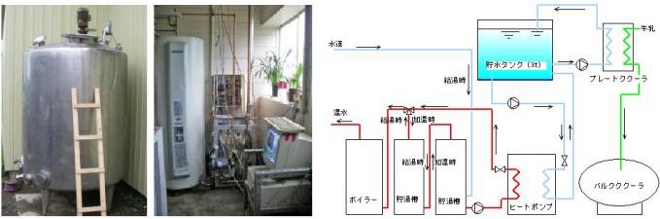 1.牛乳から熱を得た冷却水を約3tonの貯水タンクに蓄えて、搾乳時間以外の時間帯にそれを熱源とすることで温水を作るヒートポンプ給湯システムを開発しました。