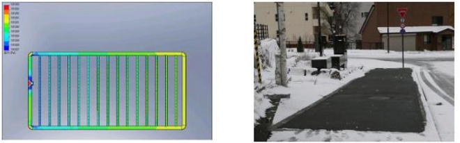 融雪システムを開発するに当たり、㈱ホクスイ設計コンサルと当場は、流体解析による有孔管の最適設計および 冬期積雪時における計測や性能評価などの技術支援を行いました。