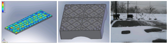 (株)ホクスイ設計コンサルでは、駐車場などの融雪部に通気性ブロックと融雪路盤体を用いた空気式融雪システムの商品化を進めています。 今回、融雪システムの性能向上と低コスト化を目的に、融雪路盤体の構造を見直すことになり、融雪性能を支配する空気の均一吹き出しのため の路盤体通気孔の最適化、ならびに路盤体高さ(脚高)の短縮による材料費・掘削費の軽減が提案されました。本研究はこれらの課題解決のため、 受託研究として実施しました。