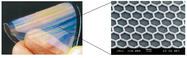ナノインプリント製品例:細胞培養シートと電子顕微鏡拡大写真(SCIVAX㈱提供)