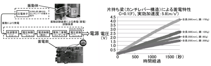 3.圧電素子を貼り付けた振動体と蓄電回路で構成されるエネルギーハーべスティングシステムの検証として、 振動試験装置を用い、自動車運送を模擬するJIS Z0232に基づくランダム振動試験の結果、共振現象が発電 (蓄電)量増加に寄与することを確認しました。