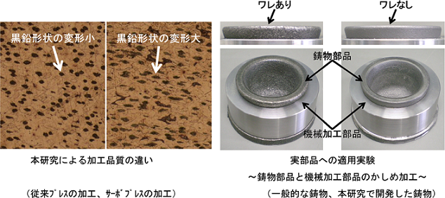 鋳物部品において、穴あけやフランジ面加工など寸法精度が必要な部分は機械加工が行われています。 機械加工のプレス加工への代替は、加工時間を短縮し生産コストを低減できるため、 自動車産業をはじめとする納期やコストの厳しい分野に適用されることが期待できます。 そこで、複雑形状を低コストで量産できる鋳造技術と高精度な形状を低コストで量産できる プレス加工技術を組み合わせた新しい量産型加工プロセスの開発に取り組みました。