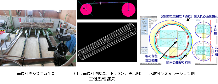 そこで、林産試験場と共同でカラマツ大径材の建築用材生産技術の検討に取り組み、その一環として 原木の形状から最適な木取りを行うための支援ツールとして、 画像処理技術を用いた原木形状計測システムの開発に取り組みました。