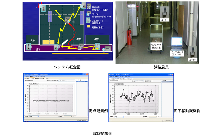 - 今後は、実際の運用を想定し、多数のセンサノードやルータから成るシステムを構築して、 病院等での評価試験を行い、実用化を進めます。
